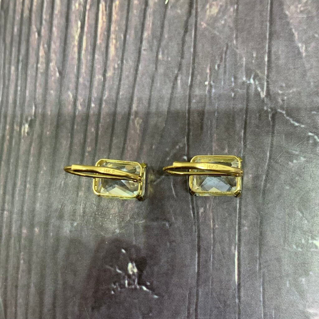 Rectangle Cut White Gem in 14k Yellow Gold Setting, Lever Back