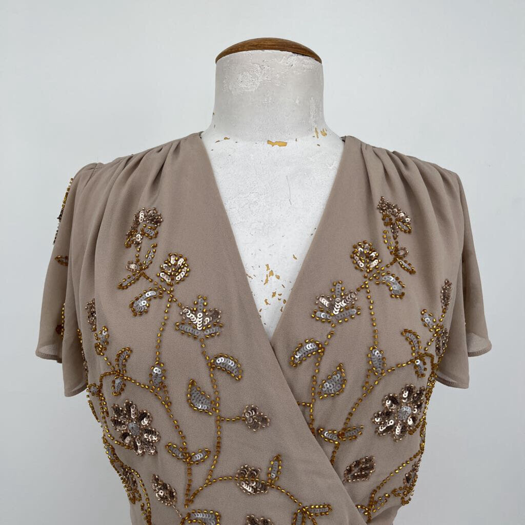 v-neck, wrap, beaded, short midi