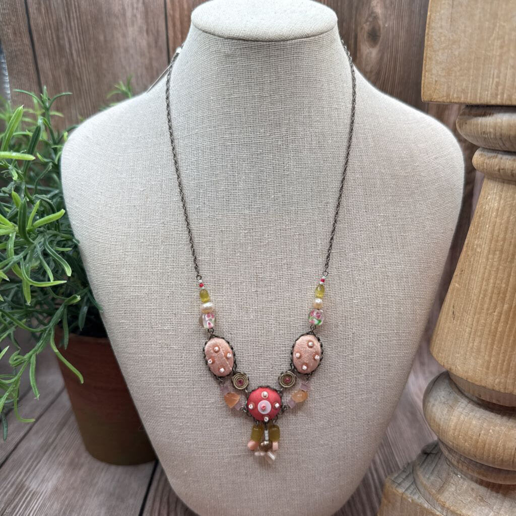 Silver Tone Chain, Fabric Cabochons, Glass Beads, Lobster Clasp