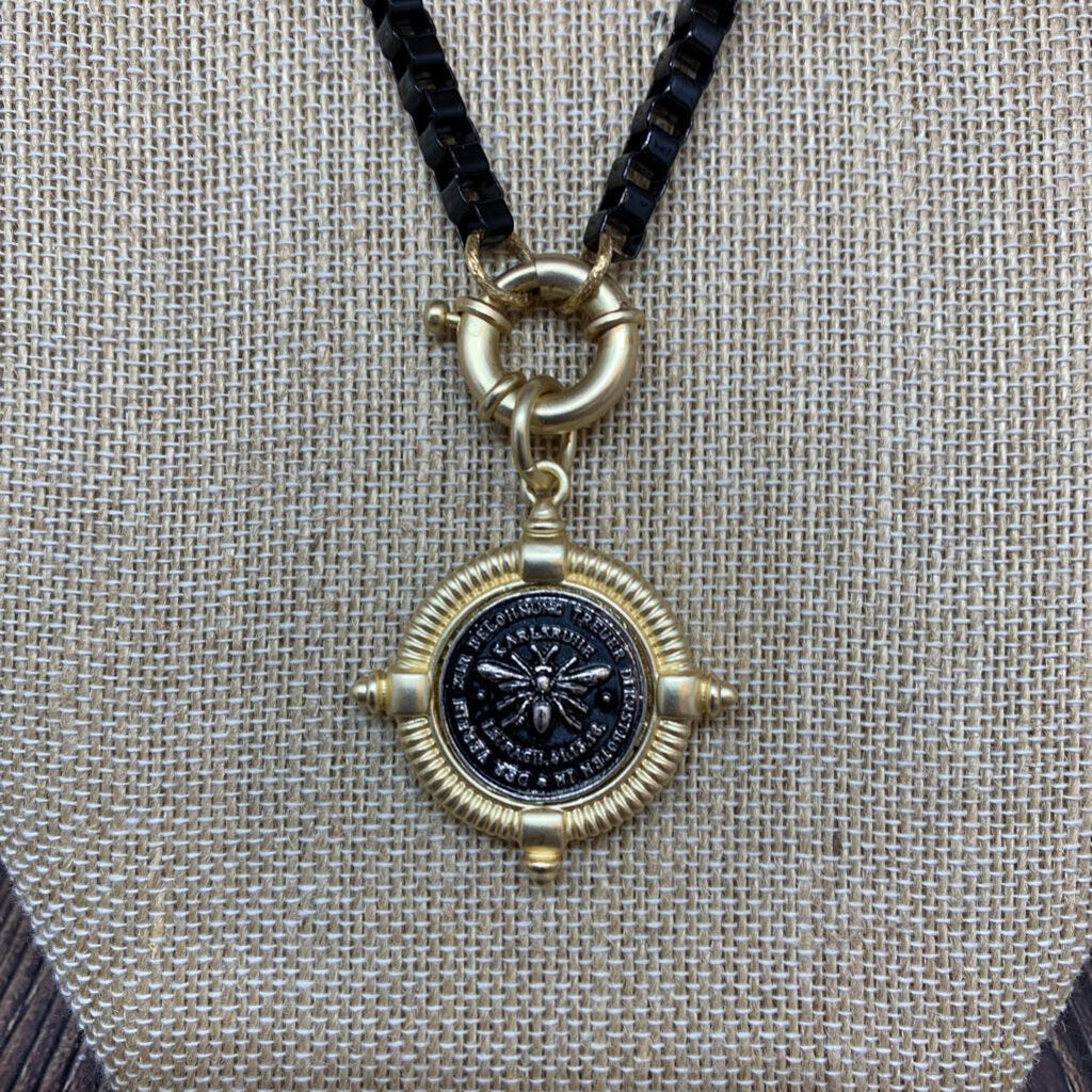 Black Chain, French Bee Replica Coin Pendant, Toggle Clasp