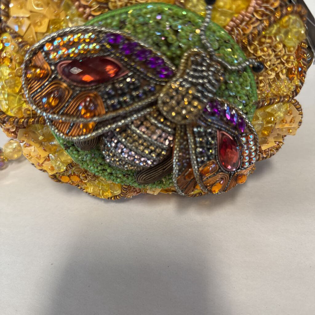 Round Beaded Purse with Bead Strap, Leather Clamshell
