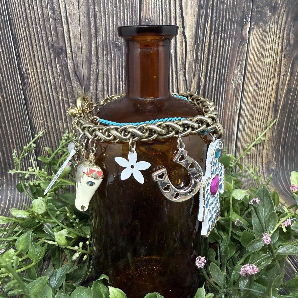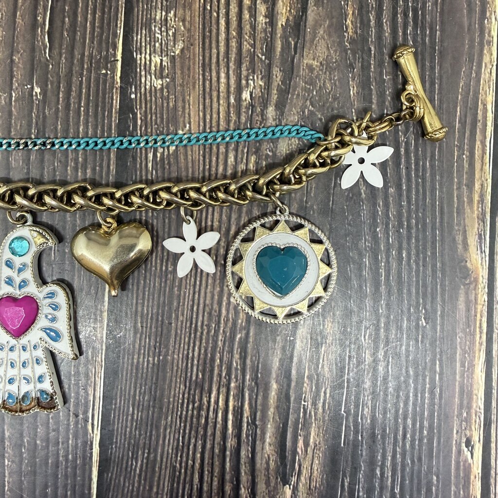 Gold Tone and Turquoise Enamel Multi Chains, Horse, Bird, Horseshoe, Sun, Heart Charms, Toggle Clasp