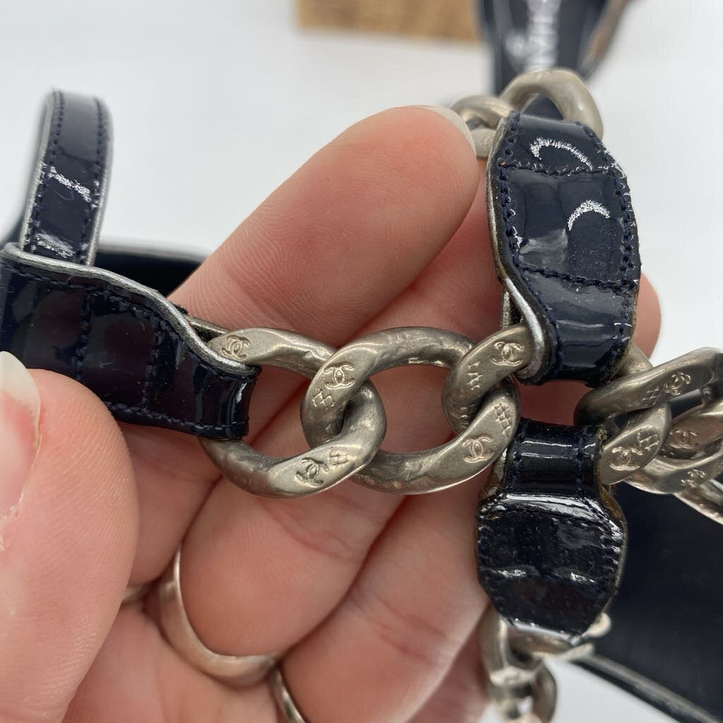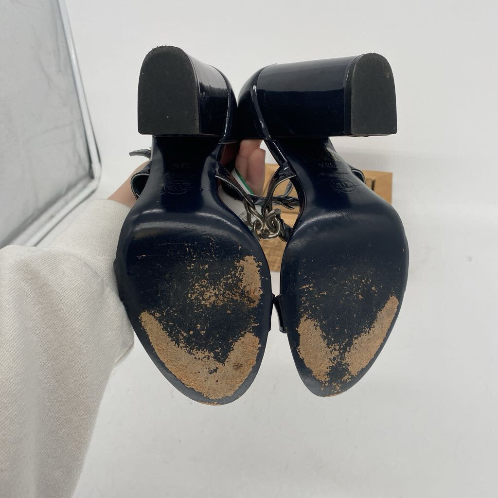 Patent leather, silver tone chain accents, 4.25 inch block heel. Not eligible for online discounts