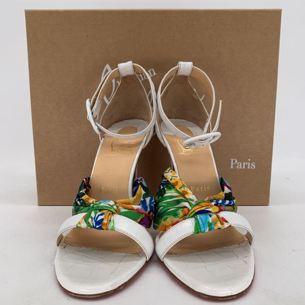 Size 37, includes dust bags, box and spare heel pads. Floral silk scarf style straps, Ruban style. Not eligible for online discounts.