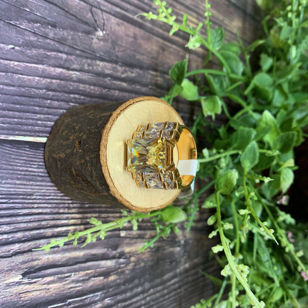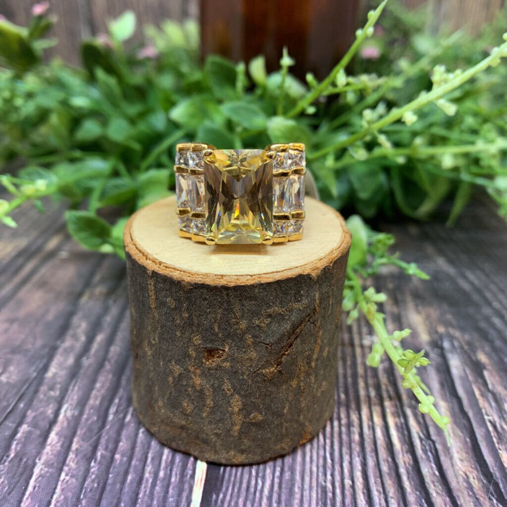 Emerald Cut Yellow Crystal with Rows of White Crystal Accents. Gold Tone Metal Band