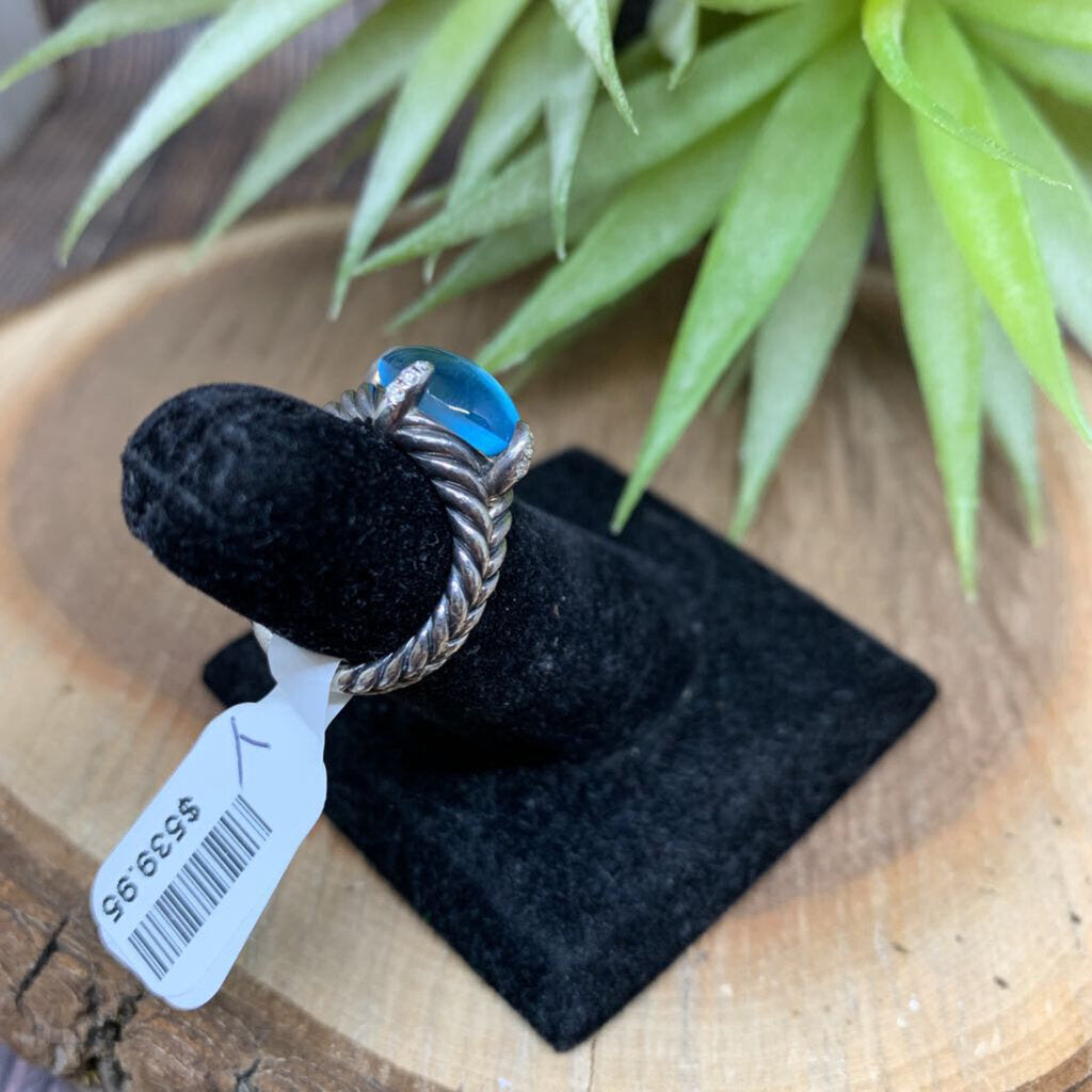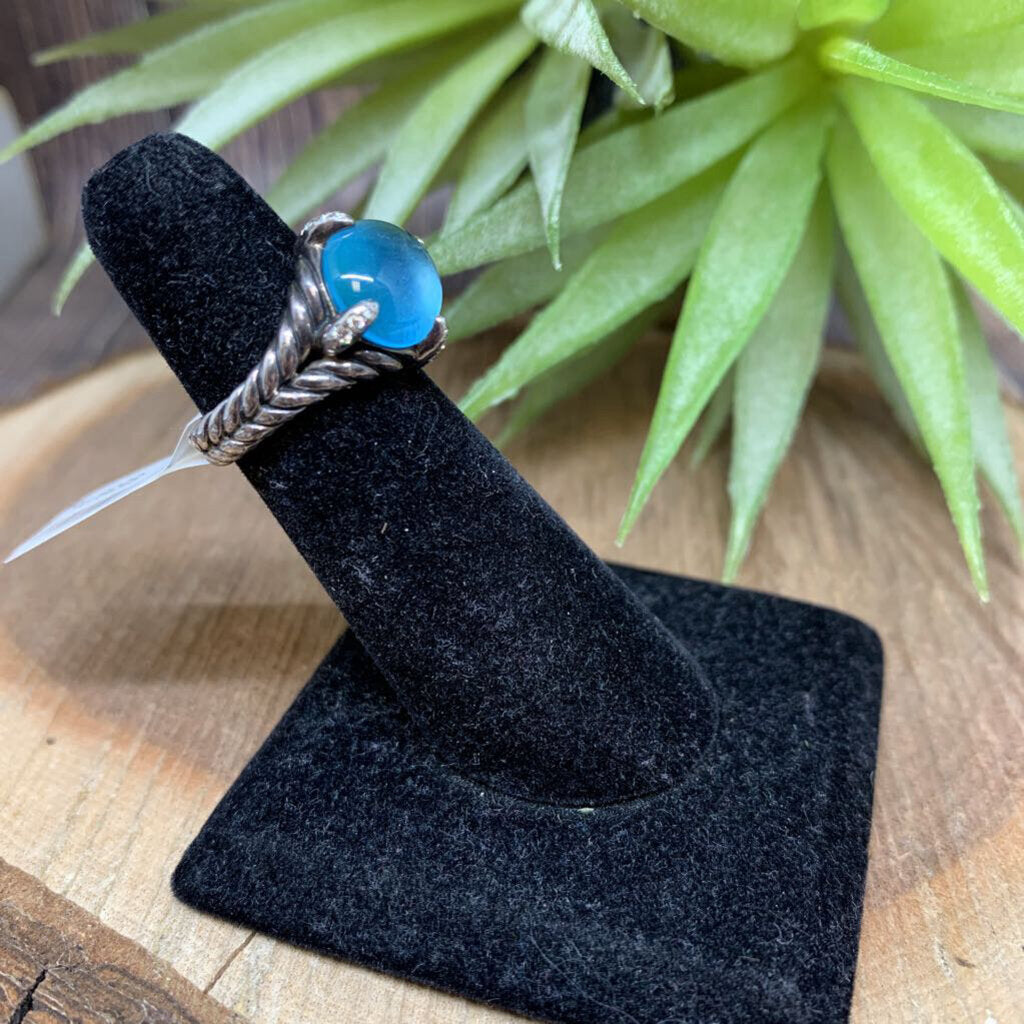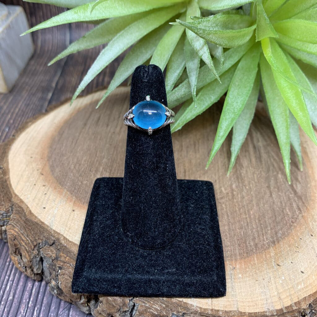Oval Blue Topaz Cabochon with Diamond Accents, Sterling Silver Cable Band