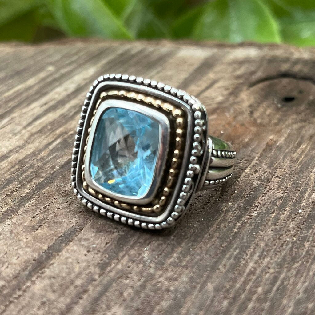 Baguette Cut Blue Topaz. Sterling Silver Setting with 14k Gold Accents, Sterling Silver Band