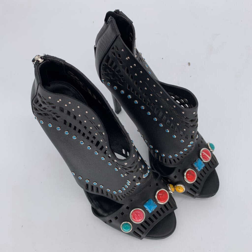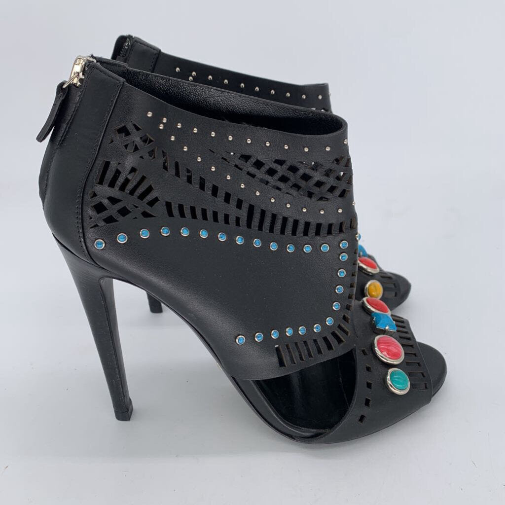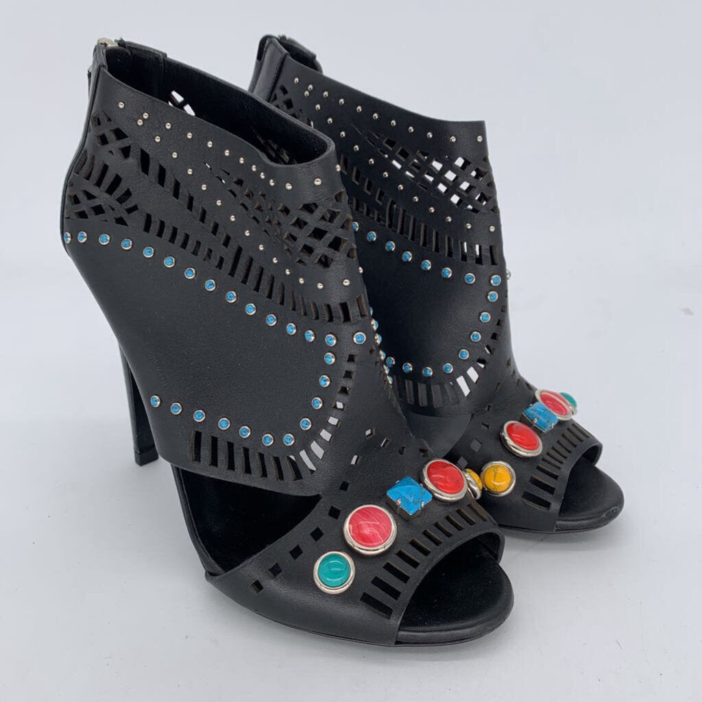 Leather with Cut-out Detail, Open Toe, Multi Color Stones, AS IS Some Wear on Front Toe, 4" Heel,