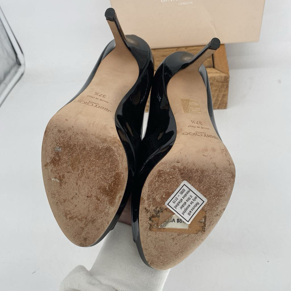 Luna peep-toe, patent leather. Some wear on the sole and puckering on leather at seams. Not eligible for online discounts