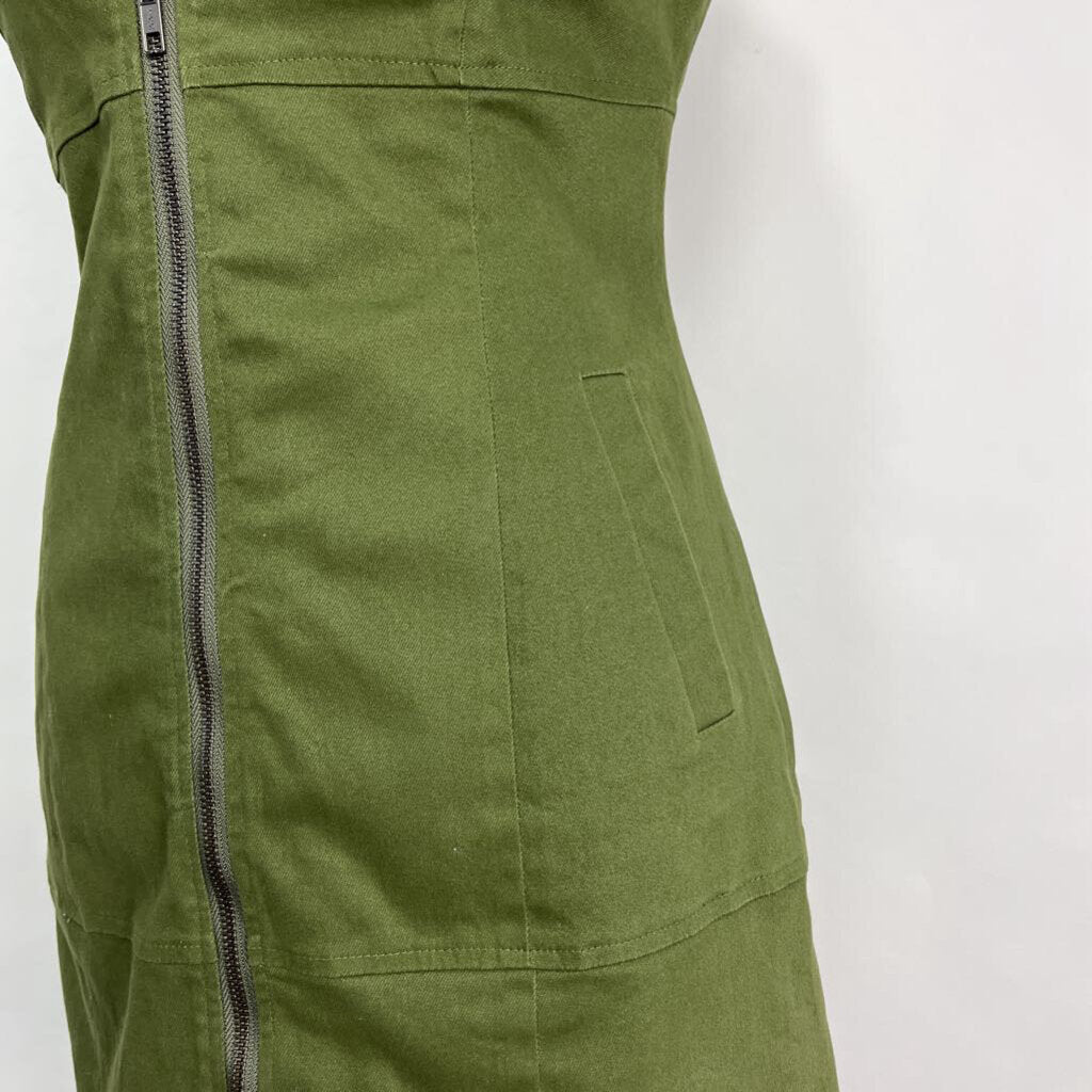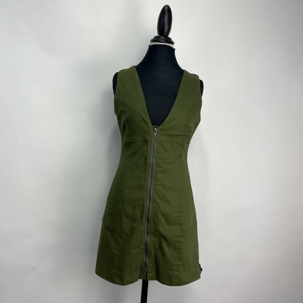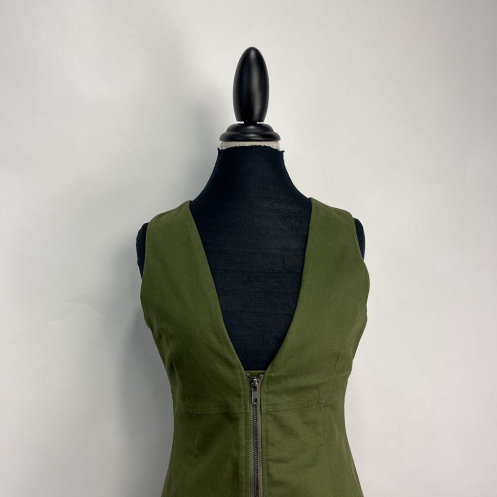 v-neck, zips up front, slit pockets, no print, at knees