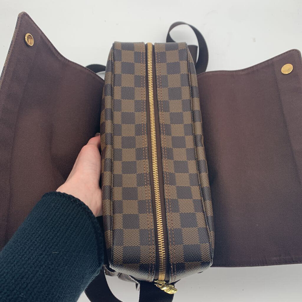 Leather, Damier Ebene Pattern, checkered pattern, gold hardware, adjustable canvas strap, zip closure. Some minor scratching on bottom. Serial Number SR0068. Not eligible for online discounts.