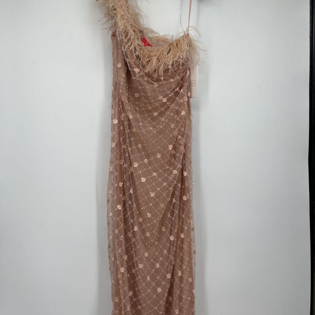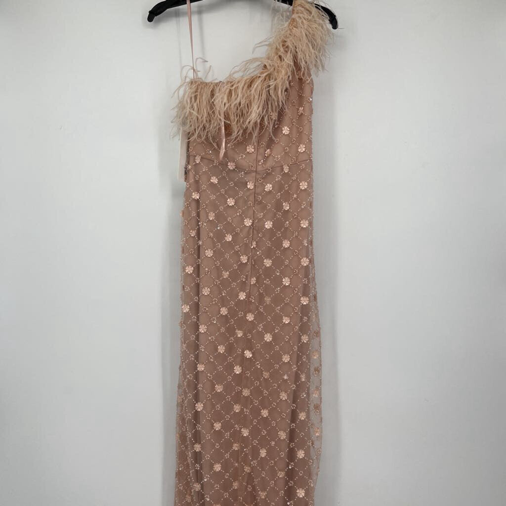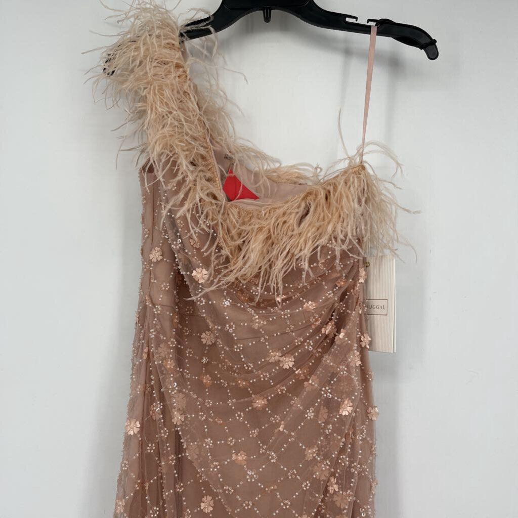 feathered trim, one shoulder, beaded sewn overlay, NEW