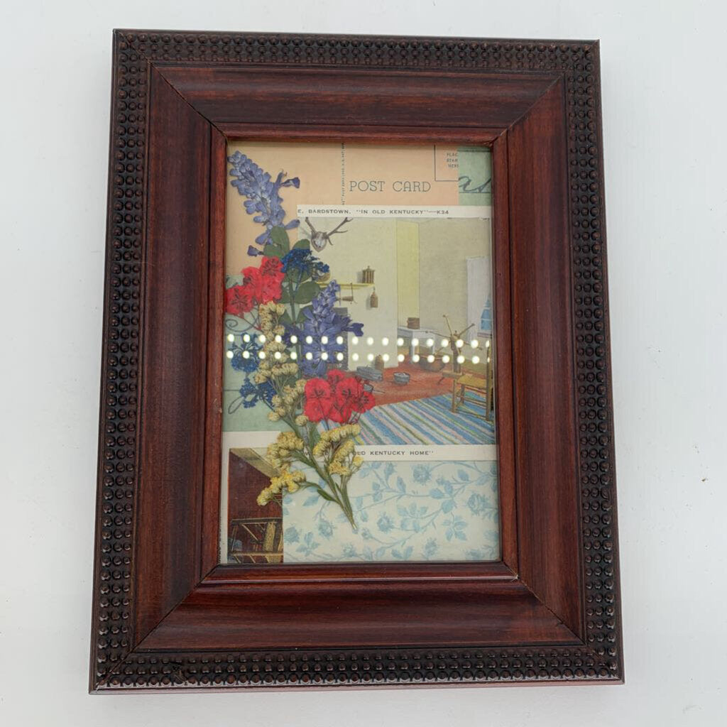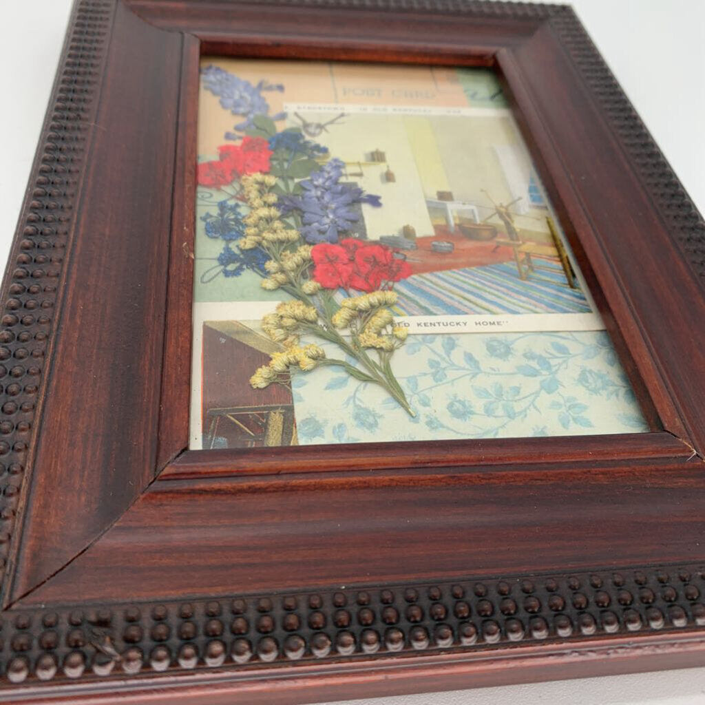 Ornate metallic frame, pressed flowers and sunset scene, easel back