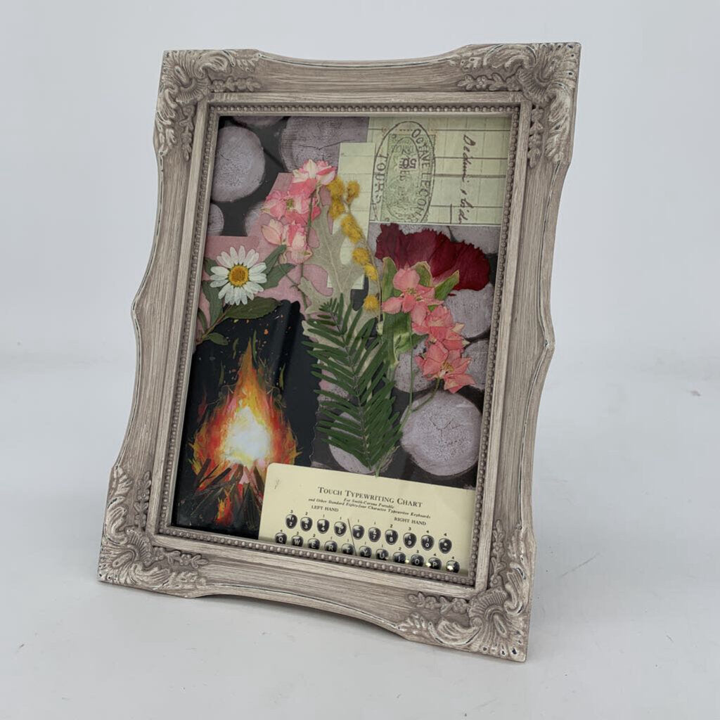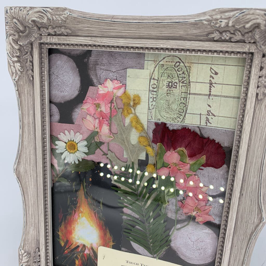 Bonefire in left hand bottom corner, type writer, Pink flowers