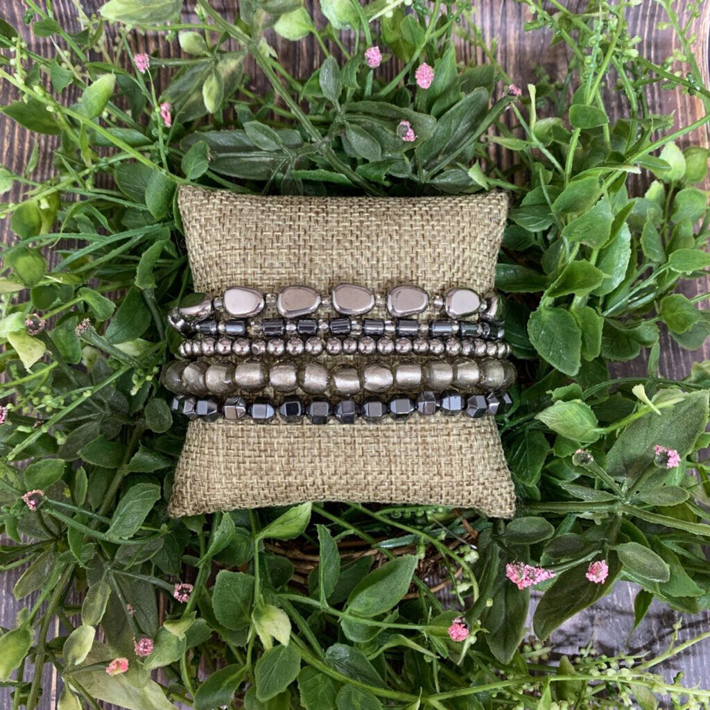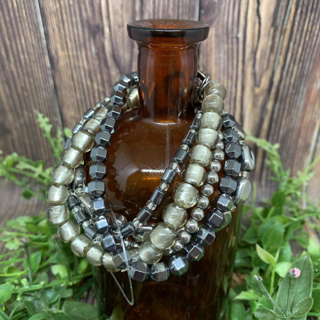 Sterling, Hematite and Glass 5 Strand Bracelet, Stretch Cord
