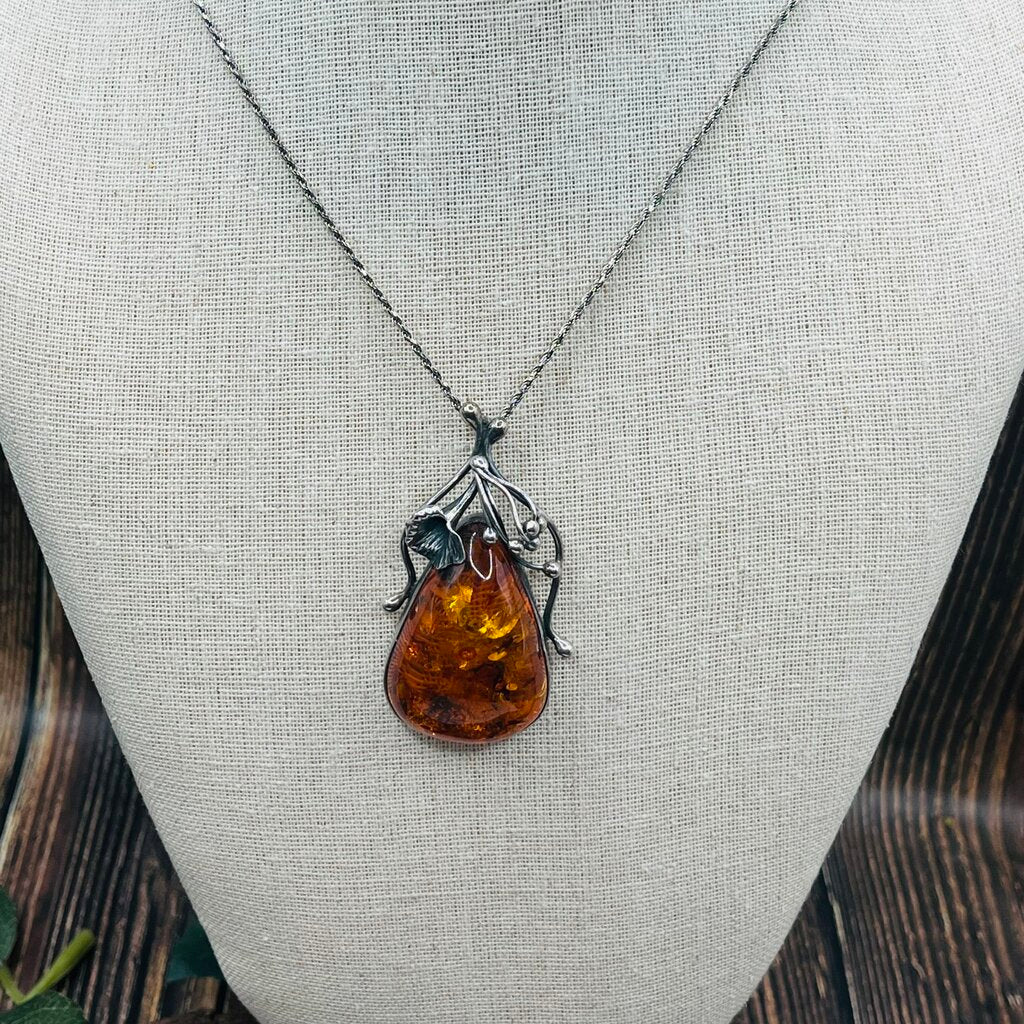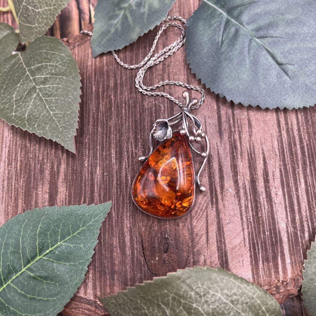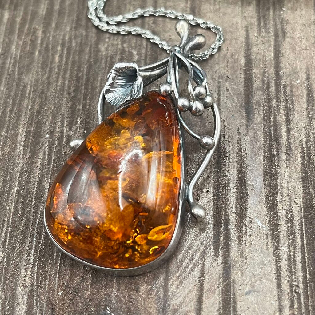 Teardrop Amber Pendant in Sterling Flower Setting, Sterling Chain