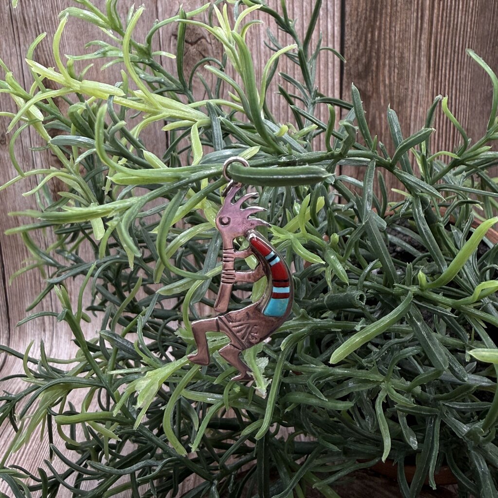 Sterling Silver Double Sided Kokopelli Flute Player Pendant with Coral and Turquoise Stone Accents