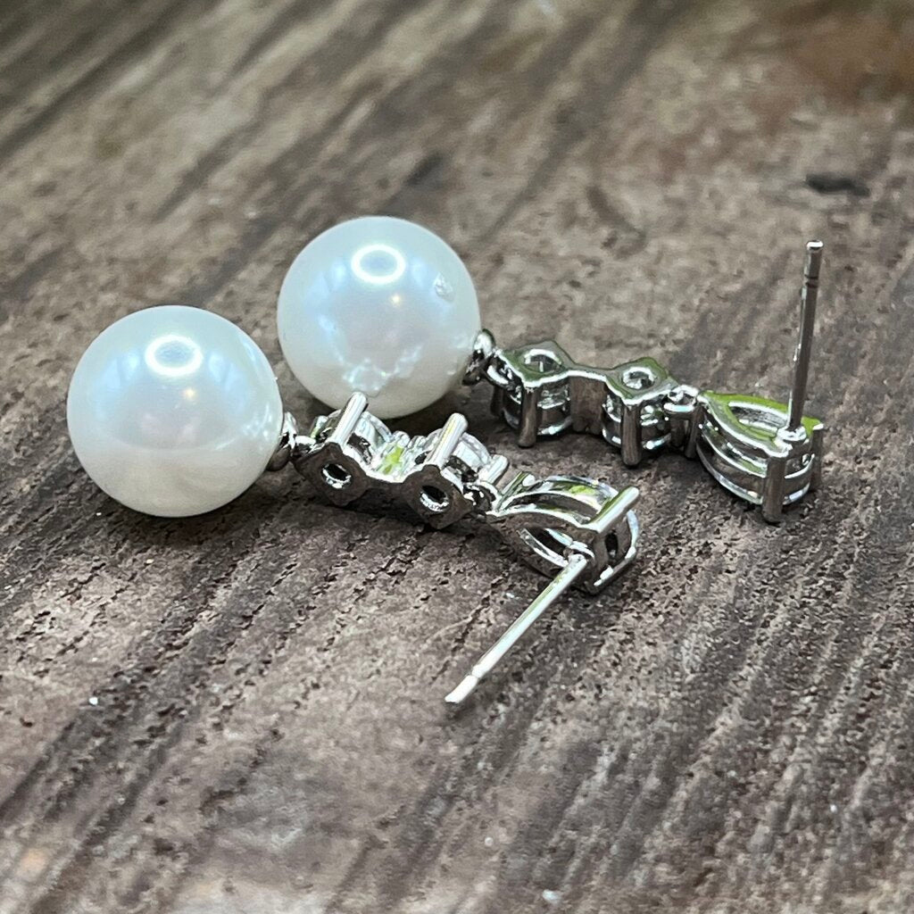 Rhodium Silver Plated, Triple Crystal Drops with Shell Pearl, Post Backs