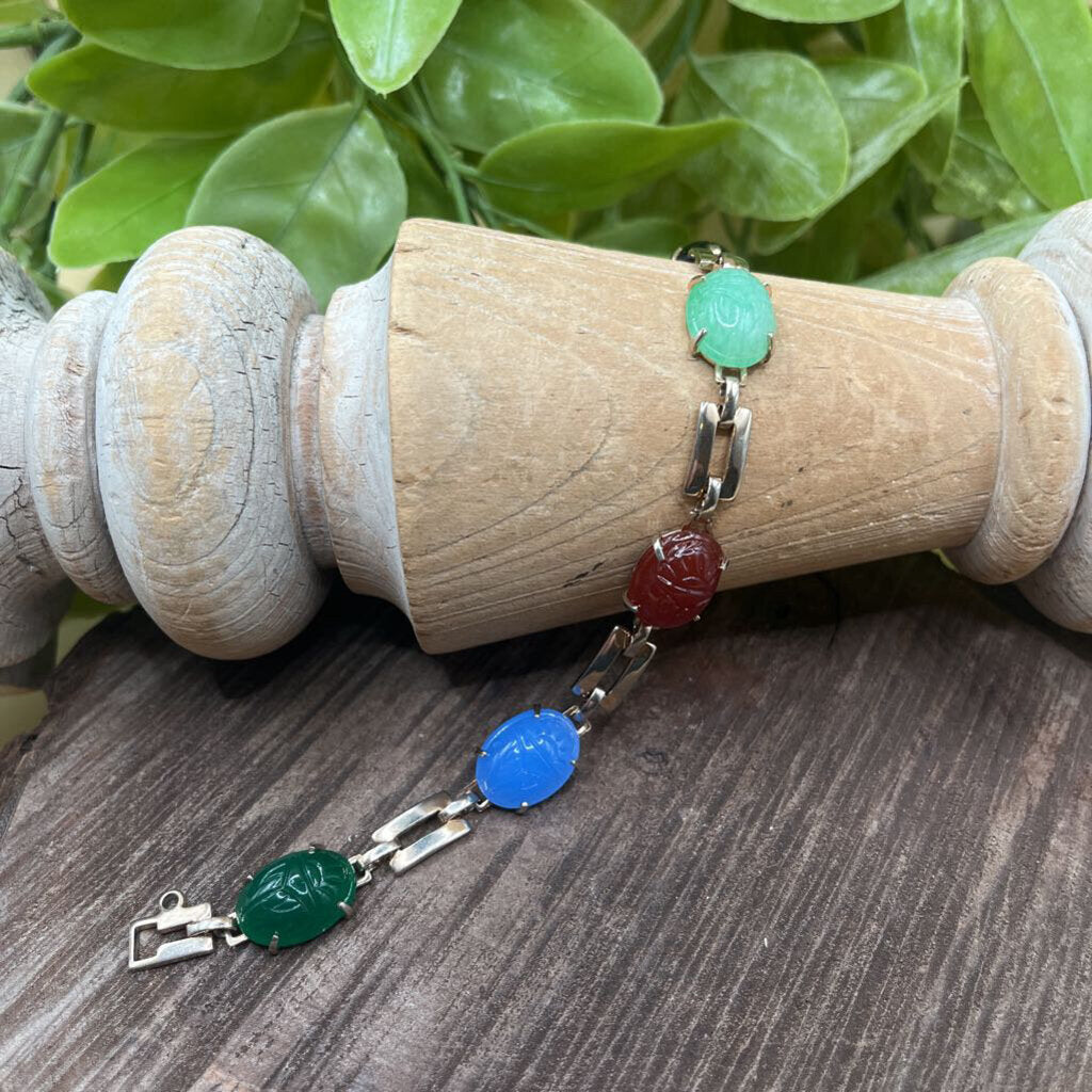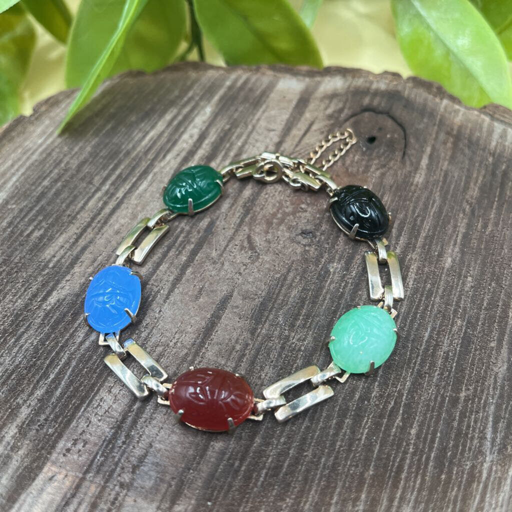 Silver Tone Metal, Multi Color Stone Scarab Beetle Links, Latch Clasp with Safety Chain